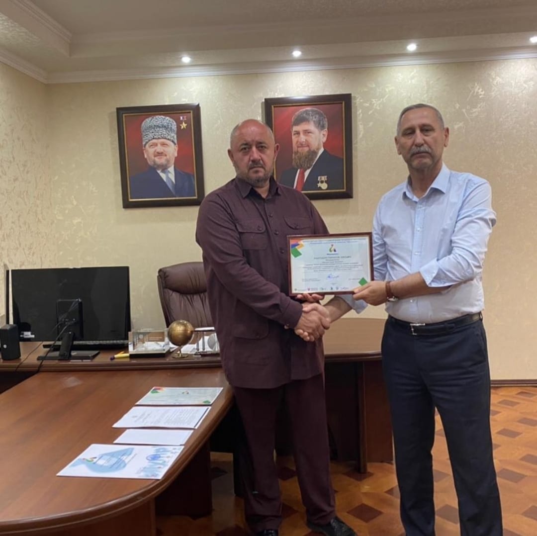 Он торжественно вручил за подписью Министра образования и науки Чеченской Республики Байсултанова Идриса Хасаевича, благодарственное письмо в адрес нашего директора Тайсумова Зураба Масудовича.