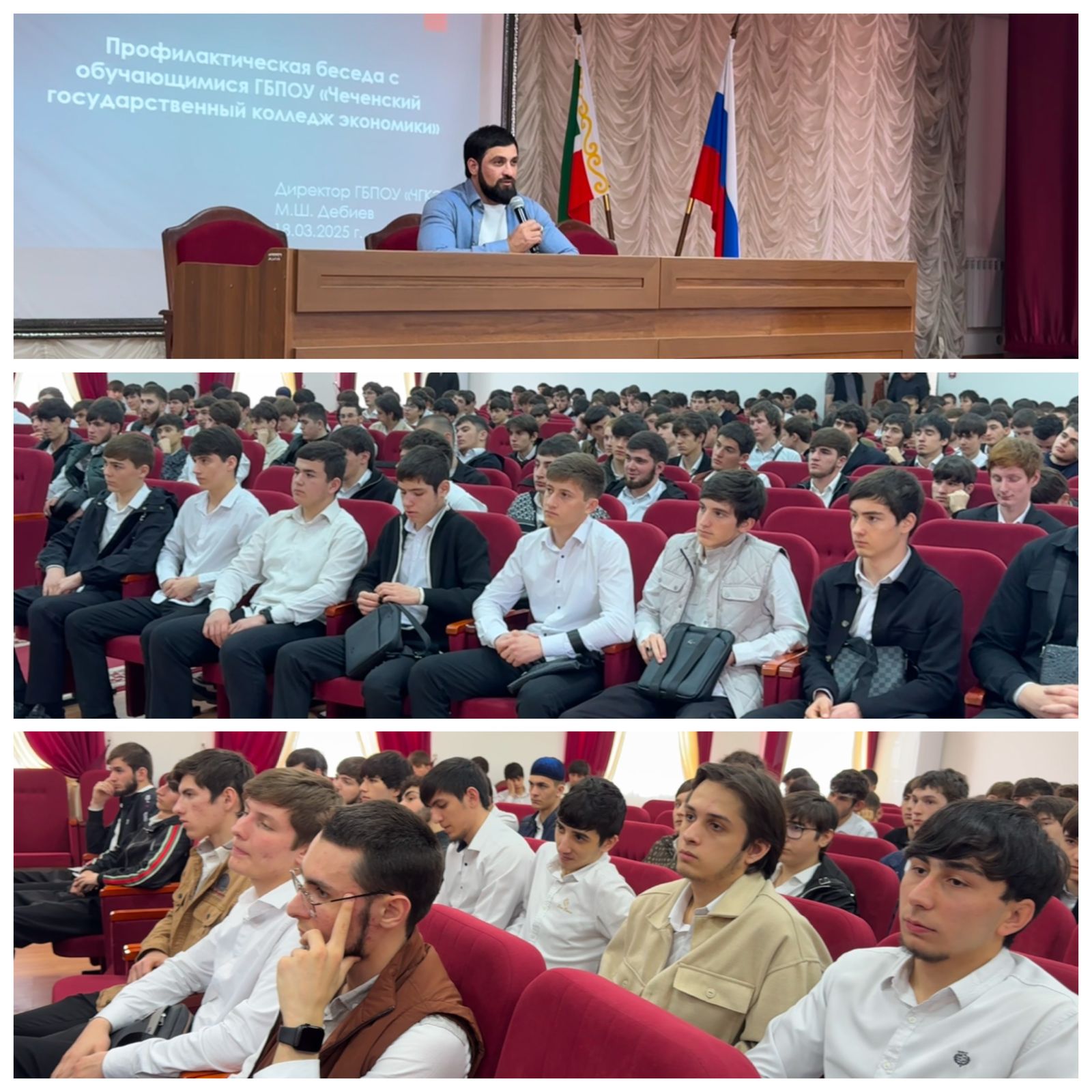 19.03.2025В ГБПОУ «ЧГКЭ» прошла профилактическая беседа директора колледжа Дебиева Магомеда Шараудиновича с обучающимися. В ходе беседы были затронуты вопросы, касающиеся соблюдения правил внутреннего распорядка, ответственности за совершение правонарушений, а также мер безопасности в повседневной жизни. Директор подчеркнул важность соблюдения законности и призвал студентов к ответственному поведению.